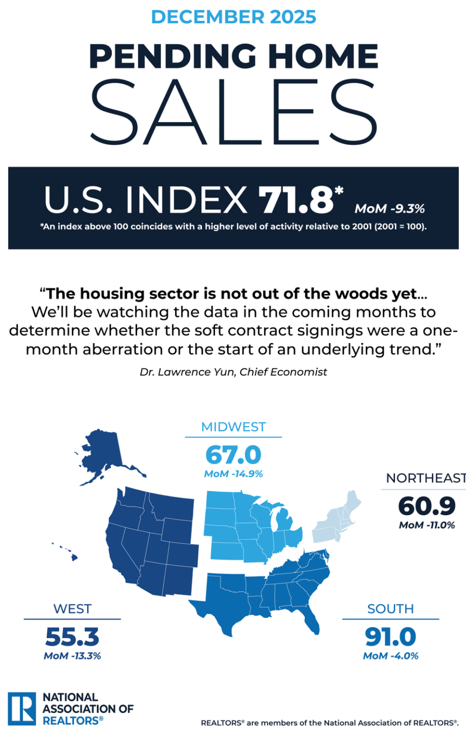 “Data shows closing activity increased in December. However, new listings did not keep pace so inventory decreased. Consumers prefer seeing abundant inventory before making the major decision of purchasing a home. So, the decline in pending home sales could be a result of dampened consumer enthusiasm about buying a home when there are so few options listed for sale. In December there were only 1.18 million homes on the market – matching the lowest inventory level of 2025.” – NAR Chief Economist Dr. Lawrence Yun